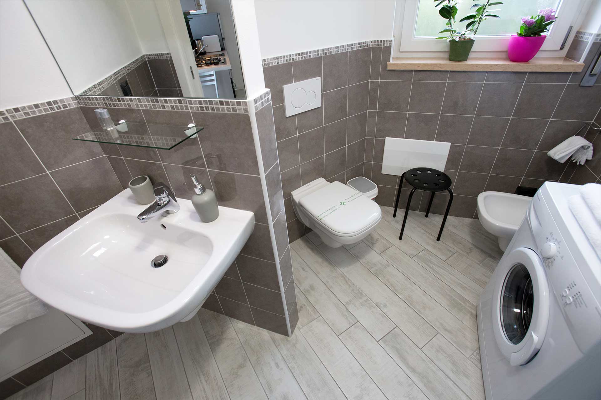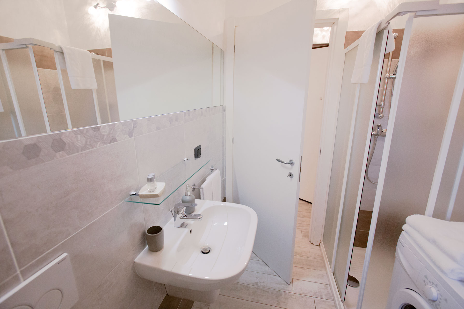 Bagno privato con doccia, lavatrice e asciugacapelli